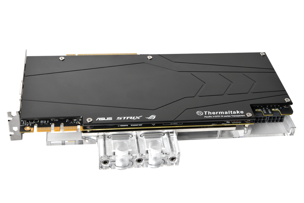 A Thermaltake, a piacvezető PC hűtő márka örömmel mutatja be az Asus gyártóval együttműködésben született Pacific V-GTX 1080Ti Transparent hűtőblokkot, mely az ASUS ROG STRIX GTX 1080 Ti teljesen felületét befedi. A gamer és a virtuális valóságot (VR) megjelenítő rendszerekhez készült, a nagy teljesítményű vízblokk korróziógátló bevonatú rézmagját CNC géppel alakították ki, prémium minőségű 4mm vastag hátlapot kapott, valamint mikro-csatornás szerkezete hozzájárul a víz megfelelő áramlásához. Ezenkívül a vízcsatorna a legtöbb G1/4 szerelvényhez illeszkedik, így univerzálisan, eszköz nélkül szerelhető és a lehető legjobb kompatibilitást biztosítja az építők számára. A fejletteb hűtési rendszerrel a hűtőblokk kiváló hűtési teljesítményt garantál, játékokhoz, túlhajtáshoz és más egyéb GPU intenzív feladatokhoz. A termék elérhetősége országonként változó lehet, ezzel kapcsolatban kérjük, keresse helyi kereskedelmi kapcsolattartóját.